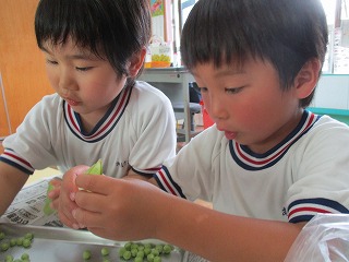 豆の皮むきに、年長さんと年中さんが挑戦しました!